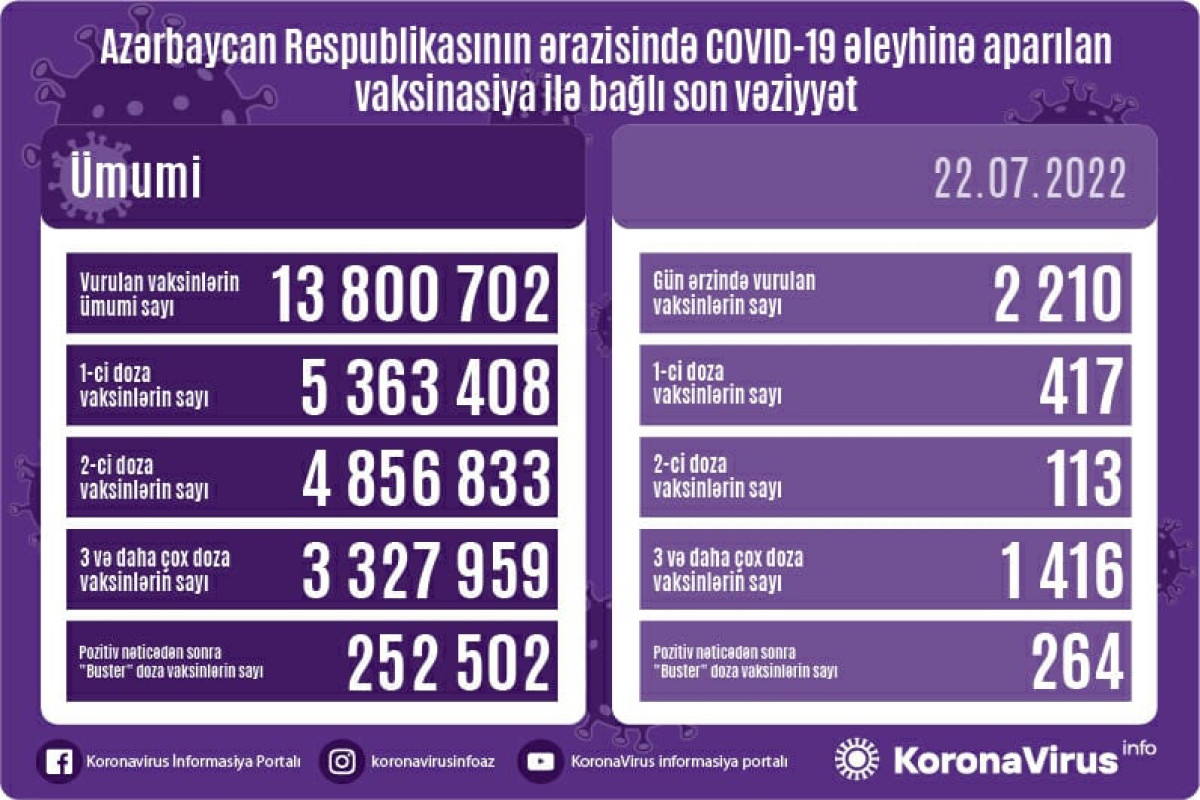 Azərbaycanda son sutkada koronavirus (COVID-19) əleyhinə 2 210 vaksin vurulub. Bir gündə birinci mərhələ üzrə vaksinasiya olunanların sayı 417, ikinci mərhələ üzrə vaksinasiya olunanların sayı 113, üç və daha çox doza vaksin vurduranların sayı 1 416, pozitiv nəticədən sonra buster doza üzrə vaksinasiya olunanların sayı isə 264 nəfərdir.
