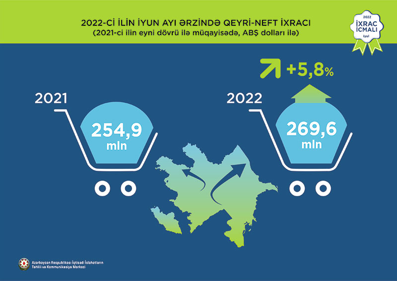 2022-ci ilin iyun ayı üzrə ixrac 3,1 mlrd ABŞ dolları təşkil edib. Qeyri-neft sektoru üzrə ixracda artım 5,8% təşkil etməklə 269,6 mln. ABŞ dolları olub. 2022-ci ilin iyun ayı ərzində yeyinti məhsulları üzrə ixrac 6,6% artaraq 119,6 milyon ABŞ dolları, qeyri-yeyinti məhsulları üzrə isə 5,1% artaraq 149,9 milyon ABŞ dolları təşkil edib.