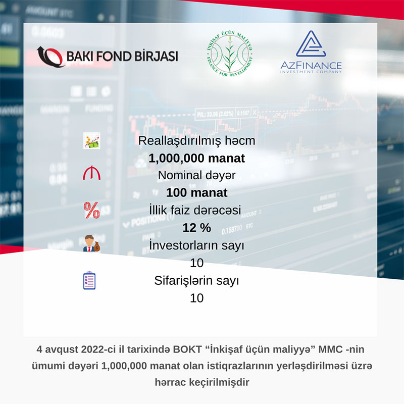 4 avqust 2022-ci il tarixində Bakı Fond Birjasında BOKT “İnkişaf üçün maliyyə” MMC-nin tədavül müddəti 2 il olan AZ2001024820 dövlət qeydiyyat nömrəli, 1 milyon manat həcmində, faizli, təmin edilməmiş sənədsiz, adlı istiqrazlarının yerləşdirilməsi üzrə hərrac yekunlaşıb.