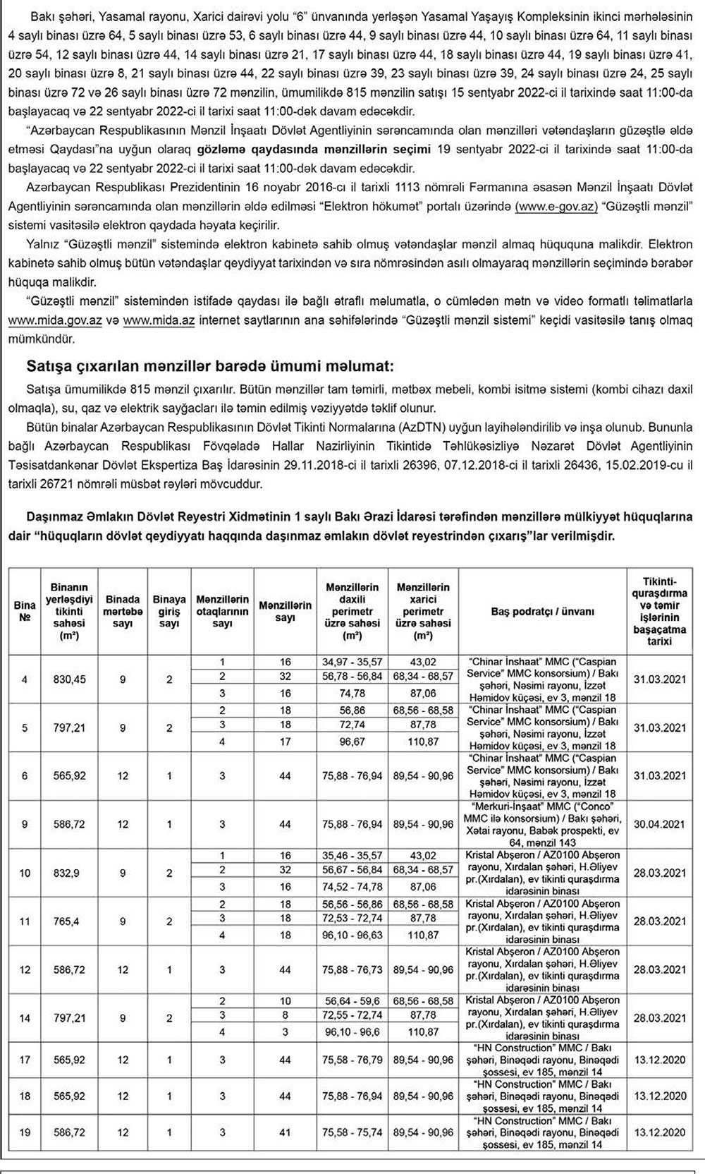 Bakı şəhəri, Yasamal rayonu, Xarici dairəvi yolu “6” ünvanında yerləşən Yasamal Yaşayış Kompleksinin ikinci mərhələsinin 4 saylı binası üzrə 64, 5 saylı binası üzrə 53, 6 saylı binası üzrə 44, 9 saylı binası üzrə 44, 10 saylı binası üzrə 64, 11 saylı binası üzrə 54, 12 saylı binası üzrə 44, 14 saylı binası üzrə 21, 17 saylı binası üzrə 44, 18 saylı binası üzrə 44, 19 saylı binası üzrə 41, 20 saylı binası üzrə 8, 21 saylı binası üzrə 44, 22 saylı binası üzrə 39, 23 saylı binası üzrə 39, 24 saylı binası üzrə 24, 25 saylı binası üzrə 72 və 26 saylı binası üzrə 72 mənzilin, ümumilikdə 815 mənzilin satışı 15 sentyabr 2022-ci il tarixində saat 11:00-da başlayacaq və 22 sentyabr 2022-ci il tarixi saat 11:00-dək davam edəcəkdir.
