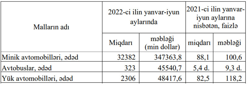 2022-ci ilin yanvar-iyun aylarında Azərbaycana 45 milyon 540,7 min dollar dəyərində 323 ədəd avtobus idxal edilib.