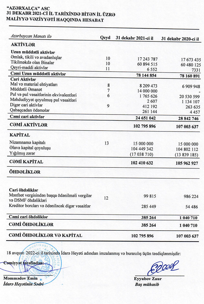 31 Dekabr 2021-ci il tarixində “Azərxalça” ASC-nin yığılmış zərəri 17 milyon 39 min manata çatıb. Yığılmış zərər ilə əlaqədar olaraq şirkətin 119 milyon 449 min manat cəmi kapitalı 102 milyon 411 min manata düşüb.