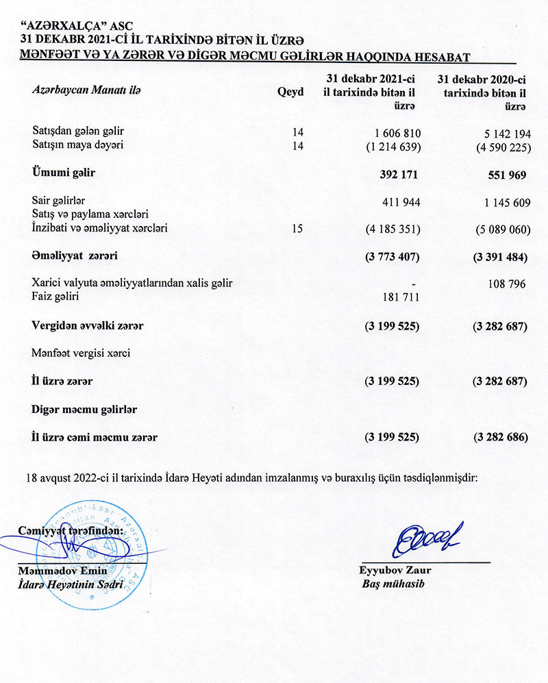 Dövlətə məxsus “Azərxalça” ASC 2021-ci ili 3 milyon 200 min manat xalis zərər ilə başa vurub. Şirkət 2020-ci ili 3 milyon 283 min manat xalis zərər ilə bağlamışdı.