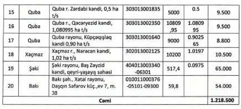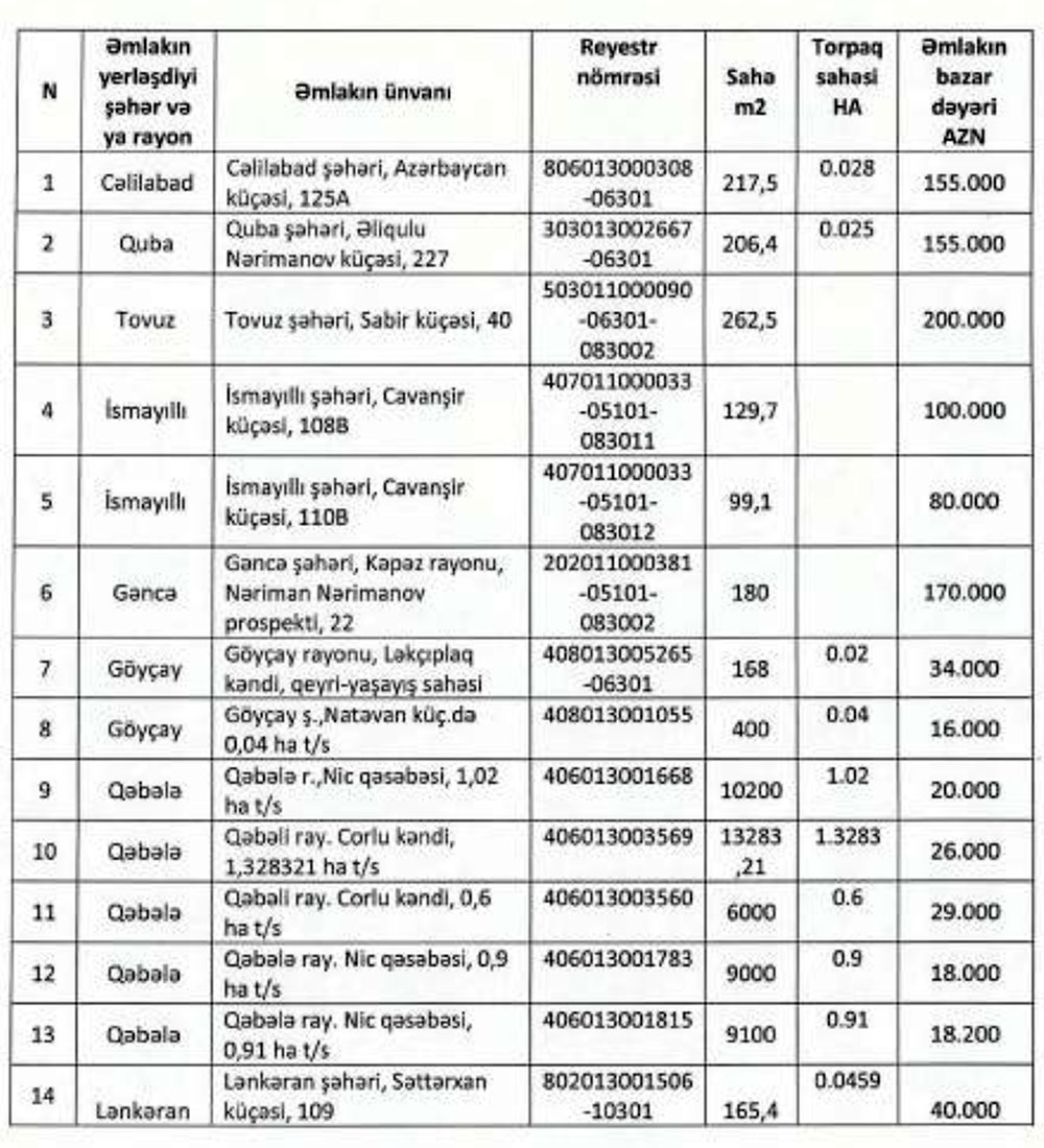 Yüklü ediləcək əmlakların siyahısı