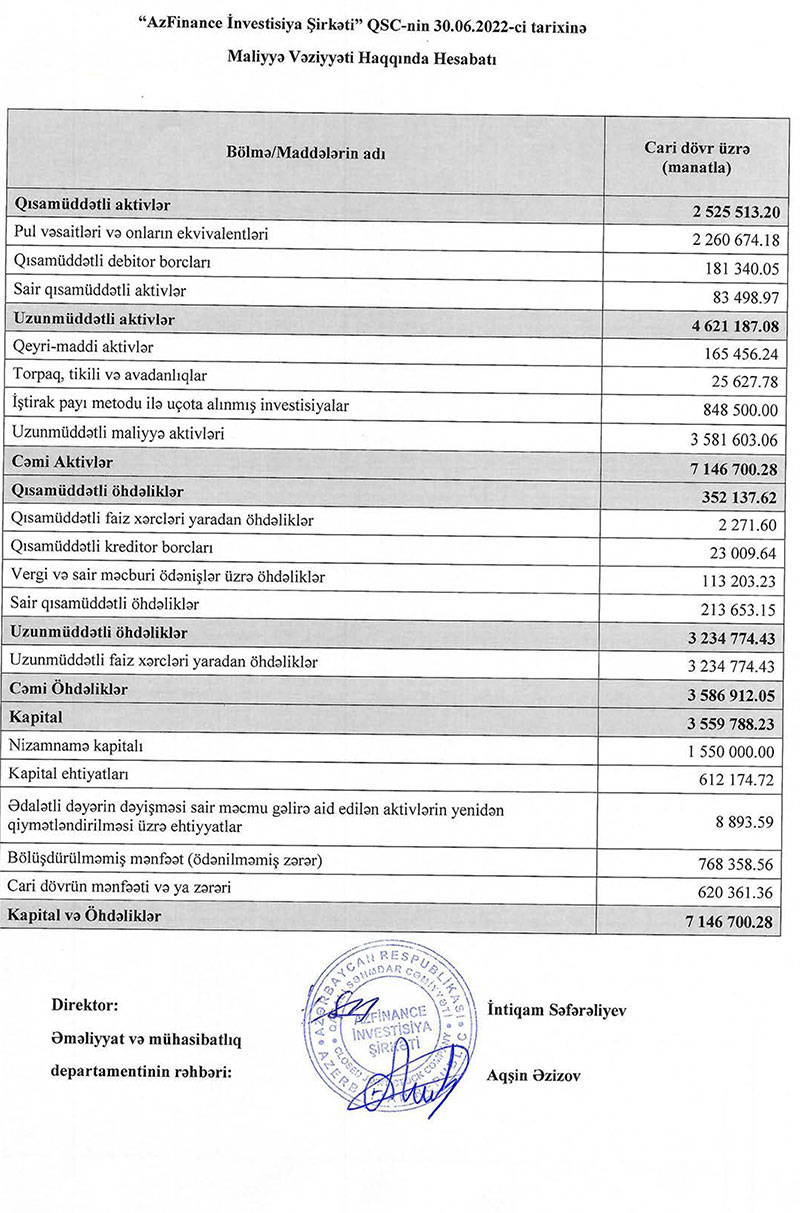 Qeyd edək ki, AzFinance İnvestisiya Şirkəti" 2020-ci ili 313 min manat, 2021-ci ili isə 870 min manat xalis mənfəət ilə başa vurmuşdu. Ötən il Şirkətin cəmi gəlirləri 2 milyon 584 min manat təşkil etmişdi.