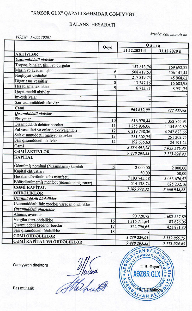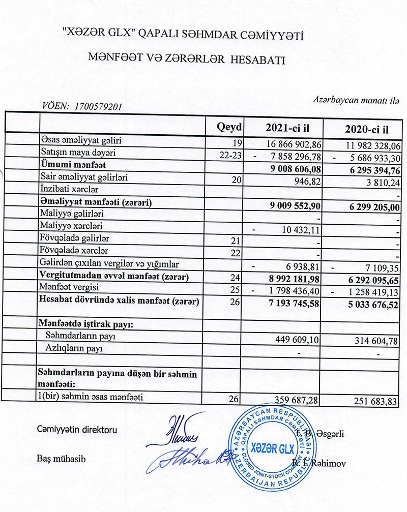 Marja.az xəbər verir ki, “Xəzər GLX” şirkətinin əsas əməliyyat gəlirləri (satış) 2020-ci ildə 11 milyon 982 min manat ikən, 2021-ci ilidə 16 milyon 867 min manata yüksəlib.
