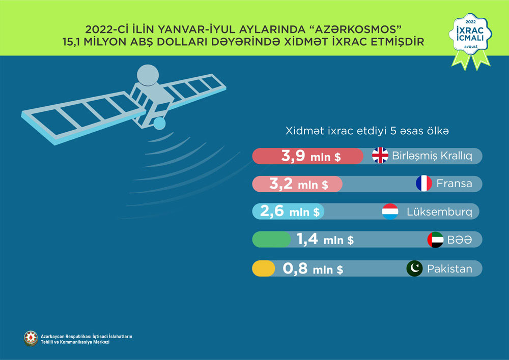 2022-ci ilin yanvar-iyul aylarında “Azərkosmos” tərəfindən dünyanın 35 ölkəsinə 15,1 milyon ABŞ dolları dəyərində xidmət (peyk telekommunikasiya xidmətləri və optik peyk xidmətləri) ixrac edilib.