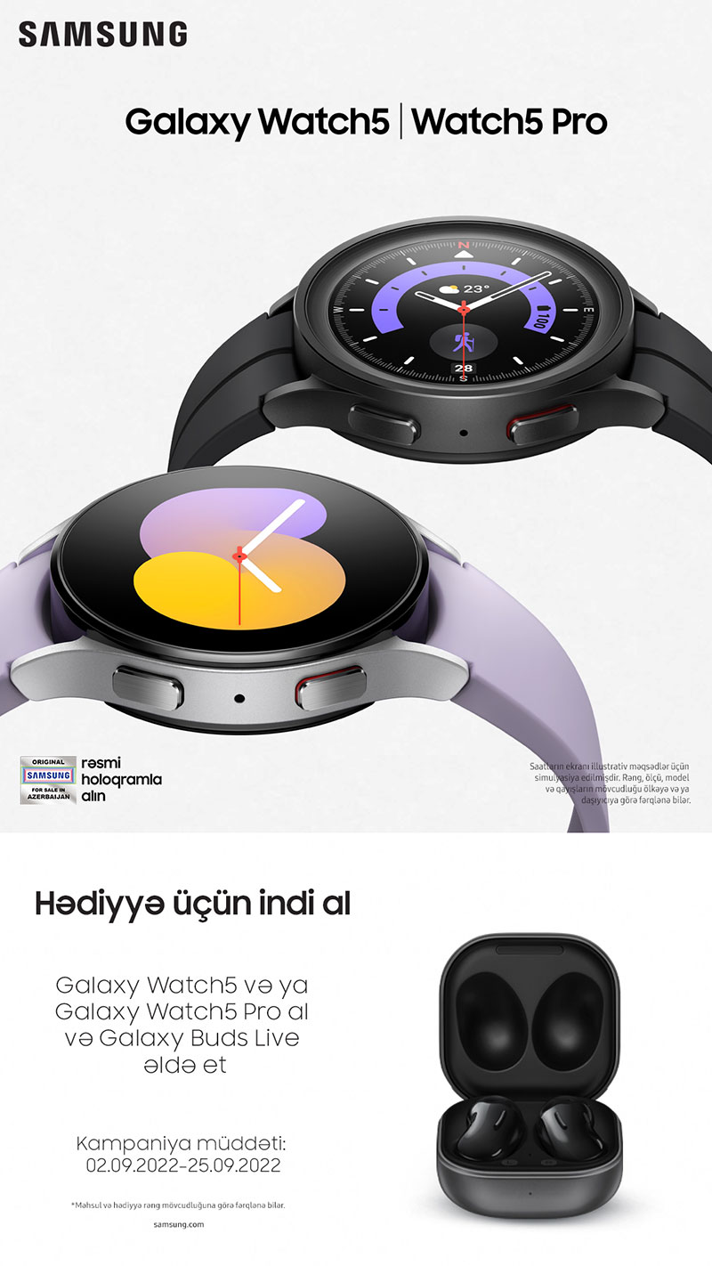 Qeyd edək ki, məhsulları rəsmi Samsung distribyutorlarından əldə etmək olar. Sentyabrın 25-nə kimi Galaxy Watch5 və ya Galaxy Watch5 Pro-nu alan hər kəs, hədiyyə olaraq Galaxy Buds Live qulaqlıqlarını əldə edəcək. Son vaxtlara qədər ağıllı saatlar vaxtı, tarixi göstərmək, hətta addımları saymaq qabiliyyətinə malik hesab olunurdu. Texnologiyaları sevən insanlar isə “elə bu qədər?” soruşurdu. Bu gün ağıllı saatların funksiyaları sizə çox şey etməyə imkan verir. Saatın unikal imkanları sayəsində sağlam həyat tərzi sürmək göründüyündən də asanlaşıb. Hər kəs bilir ki, sağlamlığa gedən yol təkcə idmandan, pis vərdişlərdən imtina etməkdən və sağlam qidalanmadan keçmir. Sağlamlığa gedən yol həmçinin nəticələrin və nizam-intizamın daimi monitorinqindən keçir. Samsung yeni nəsil ağıllı geyilə bilən cihazlarla bunu çox asanlaşdırır. Əvvəlki modellərdən fərqli olaraq, Galaxy Watch5 gündəlik funksiyaları və məqsədlərinizə daha səmərəli şəkildə çatmağınıza kömək edəcək parametrləri təkmilləşdirib. Galaxy Watch5 Pro sapfir kristal və titan korpusu ilə 2 dəfə daha davamlıdır.