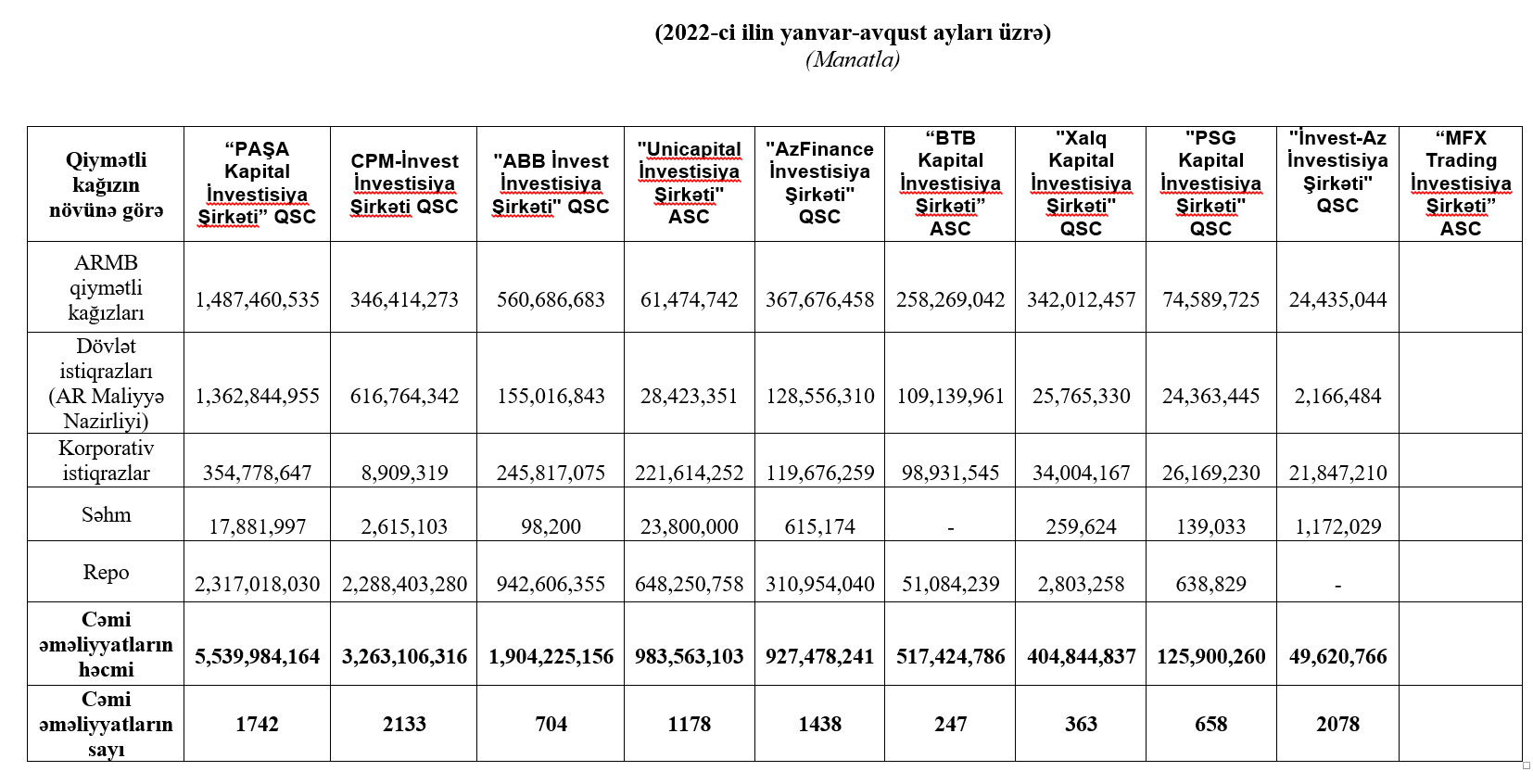 Marja Birjaya istinadən xəbər verir ki, dövriyyənin həcminə görə “PAŞA Kapital İnvestisiya Şirkəti” 1-ci, “ CPM-İnvest İnvestisiya Şirkəti” 2-ci, "ABB İnvest İnvestisiya Şirkəti" 3-cü yeri tutub.
