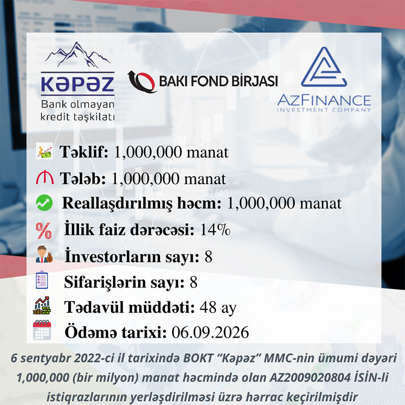 6 sentyabr 2022-ci il tarixində Bakı Fond Birjasında BOKT “Kəpəz” MMC-nin tədavül müddəti 48 ay olan AZ2009020804 dövlət qeydiyyat nömrəli, 1 milyon manat həcmində, faizli, təmin edilməmiş sənədsiz, adlı istiqrazlarının yerləşdirilməsi üzrə hərrac yekunlaşıb.