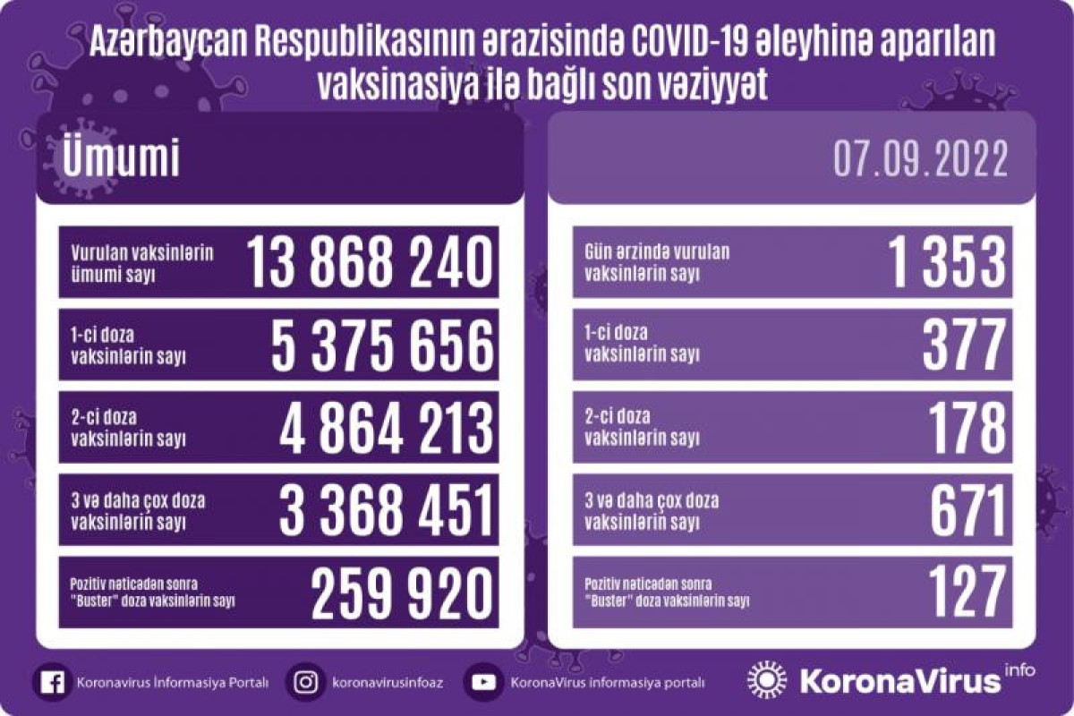 Azərbaycanda son sutkada koronavirus (COVID-19) əleyhinə 1 353 vaksin vurulub. Bir gündə birinci mərhələ üzrə vaksinasiya olunanların sayı 377, ikinci mərhələ üzrə vaksinasiya olunanların sayı 178, üç və daha çox doza üzrə vaksinasiya olunanların sayı 671, pozitiv nəticədən sonra buster doza üzrə vaksinasiya olunanların sayı 127 nəfərdir.