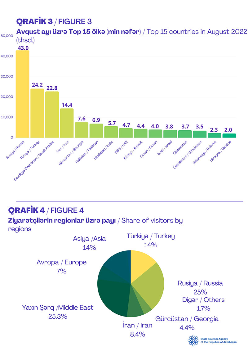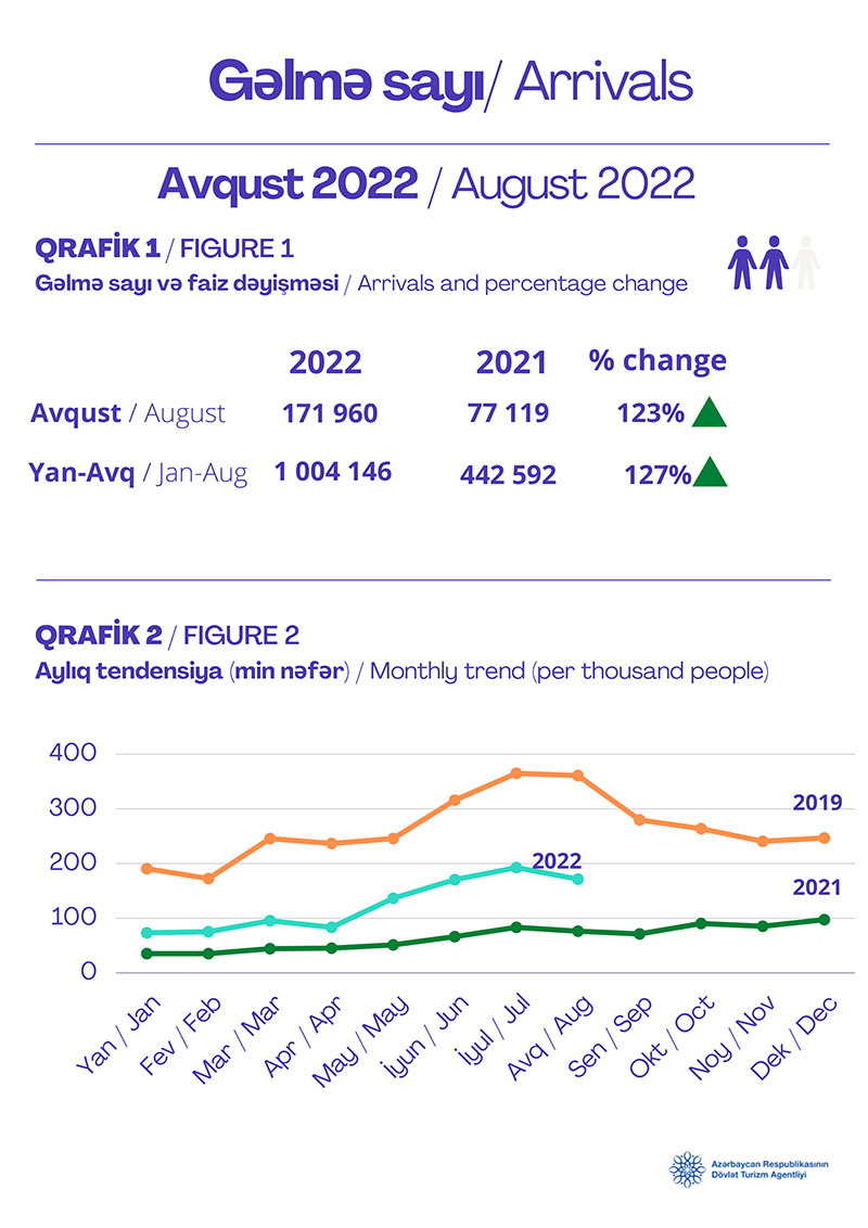 2022-ci ilin avqust ayında Azərbaycana 171 min 960 nəfər, 8 ayı ərzində isə 1 milyon 4 min 146 nəfər turust gəlib.