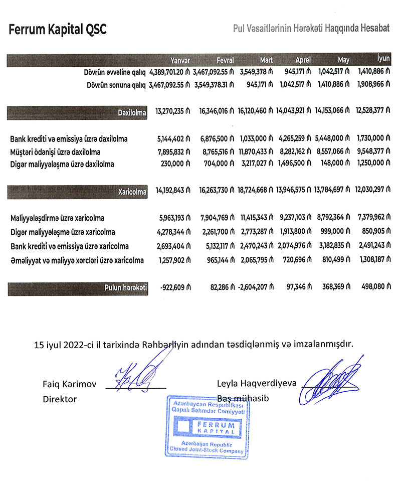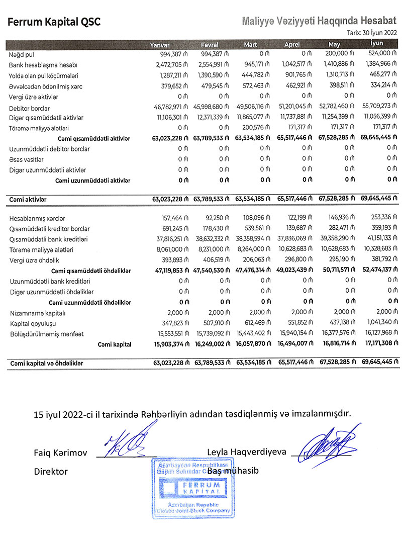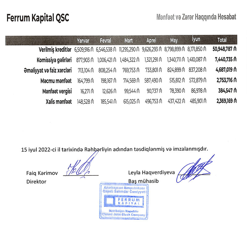 Faktorinq şirkəti "Ferrum Kapital" QSC 2022-ci ilin birinci yarısını (yanvar-iyun dövrünü) 2 milyon 369 min manat xalis mənfəət ilə başa vurub.
