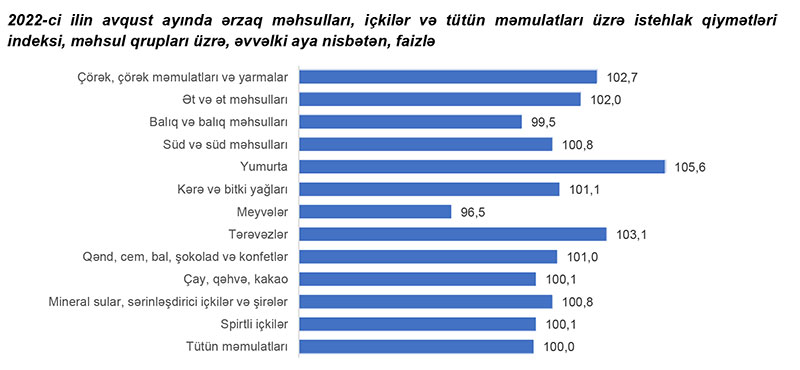 2022-ci ilin avqust ayında ərzaq məhsulları, içkilər və tütün məmulatları üzrə istehlak qiymətləri indeksi əvvəlki aya nisbətən 1,2 faiz, əvvəlki ilin avqust ayına nisbətən 20,8 faiz təşkil etmişdir.
