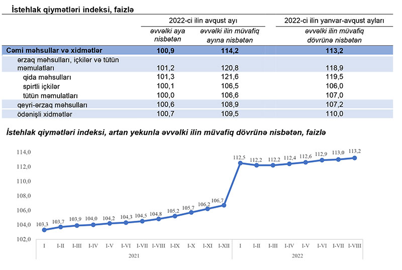 Azərbaycanda inflyasiya 13,2%-dən 13%-ə sürətlənib. Ötən ilin avqust ayı ilə müqayisədə 2022-ci ilin avqust ayında qiymətlər 14,2 faiz, ərzaq məhsulları, içkilər və tütün məmulatları üzrə qiymətlər isə 20,8 faiz yüksəlib.2022-ci ilin yanvar-avqust aylarında Azərbaycanda istehlak qiymətləri indeksi (inflyasiya göstəricisi) 2021-ci ilin yanvar-avqust aylarına nisbətən 13,2 faiz, o cümlədən ərzaq məhsulları, içkilər və tütün məmulatları üzrə 18,9 faiz, qeyri-ərzaq məhsulları üzrə 7,2 faiz, əhaliyə göstərilmiş ödənişli xidmətlər üzrə 10,0 faiz artıb.