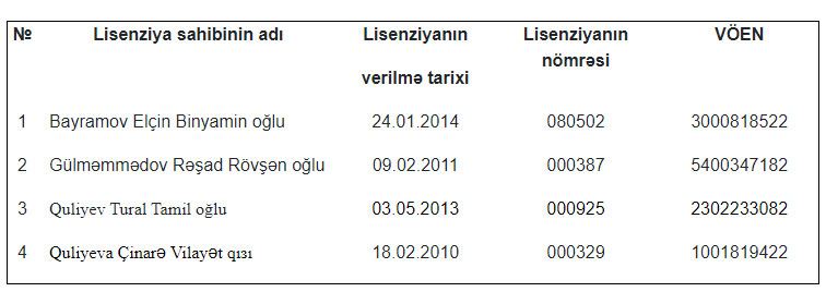 Mərkəzi Bankdan verilən məlumata görə, “Sığorta fəaliyyəti haqqında” Azərbaycan Respublikası Qanununun 107.1.3-cü maddəsinə əsasən 12 ay ərzində lisenziyalarının qüvvəsinin iki dəfə dayandırılmasına səbəb olmuş hal, lisenziyaların qüvvəsinin həmin hal əsasında sonuncu dəfə dayandırıldığı tarixdən etibarən 9 ay ərzində təkrar yarandığını nəzərə alaraq Azərbaycan Respublikası Mərkəzi Bankının İdarə Heyətinin 07 sentyabr 2022-ci il tarixli qərarı ilə siyahıda göstərilən (siyahı əlavə olunur) 4 nəfər fiziki şəxsə sığorta agenti fəaliyyətinə verilmiş lisenziyalar ləğv edilib.