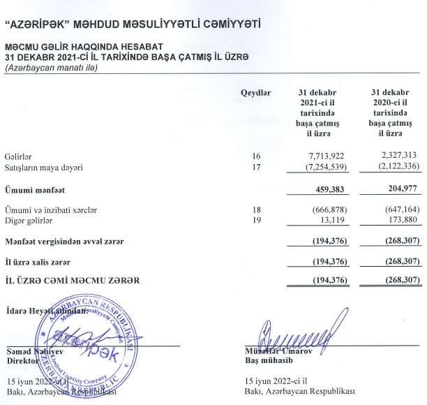 "Azərbaycan Sənaye Korporasiyası" ASC-nin törəmə şirkəti olan “Azəripək” MMC 2021-ci ili 194 min manat xalis zərər ilə başa vurub. Halbuki, şirkət 2020-ci ili 268 min manat xalis zərər ilə bağlamışdı.Beləliklə, 2020-ci illə müqayisədə 2021-ci ildə “Azəripək” MMC-nin xalis zərəri 27,6% azalıb.