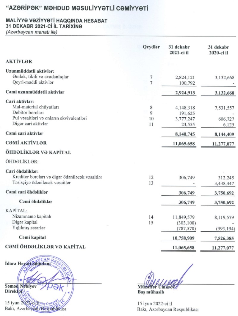 31 Dekabr 2021-ci il tarixində “Azəripək” MMC 11 milyon 66 min manat cəmi aktivlərə malik olub. Şirkət 2020-ci ilin sonunda 11 milyon 277 min manat cəmi aktivlərə malik idi.