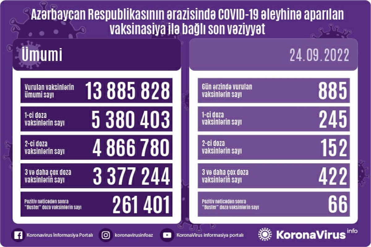 Azərbaycanda son sutkada koronavirus (COVID-19) əleyhinə 885 vaksin vurulub. Bir gündə birinci mərhələ üzrə vaksinasiya olunanların sayı 245, ikinci mərhələ üzrə vaksinasiya olunanların sayı 152, üç və daha çox doza vaksin vurduranların sayı 422, pozitiv nəticədən sonra buster doza üzrə vaksinasiya olunanların sayı isə 66 nəfərdir.