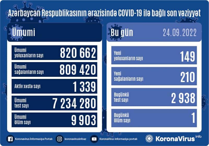 Azərbaycanda koronavirus (COVID-19) infeksiyasına 149 yeni yoluxma faktı qeydə alınıb, 210 nəfər müalicə olunaraq sağalıb.