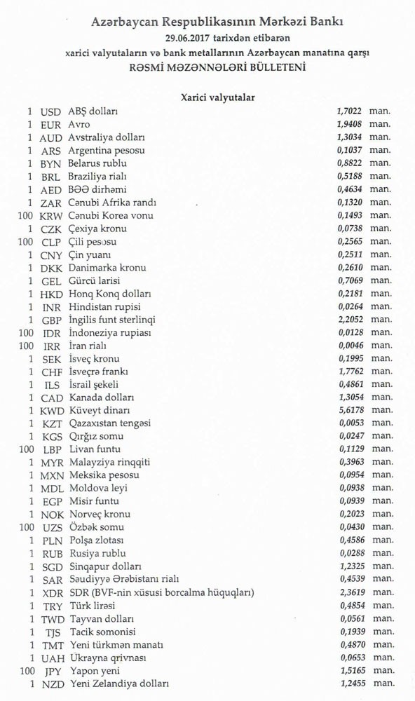 İyunun 29-na Mərkəzi Bankın açıqladığı rəsmi Dollar/manat məzənnəsi İyunun 23-ü ilə müqayisədə dəyişməyərək 1,7022 manat olub, Avro/manat məzənnəsi 1.9408 manata qalxıb.