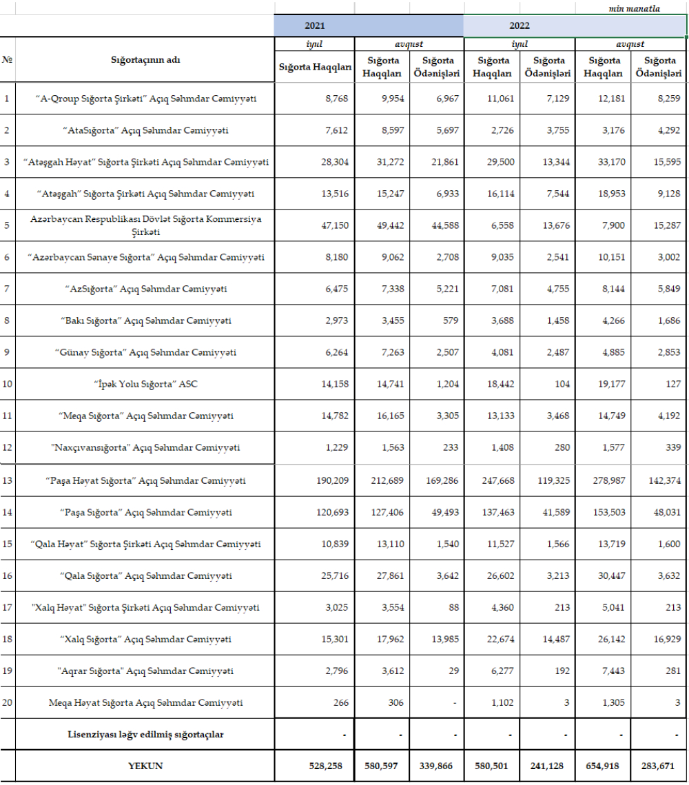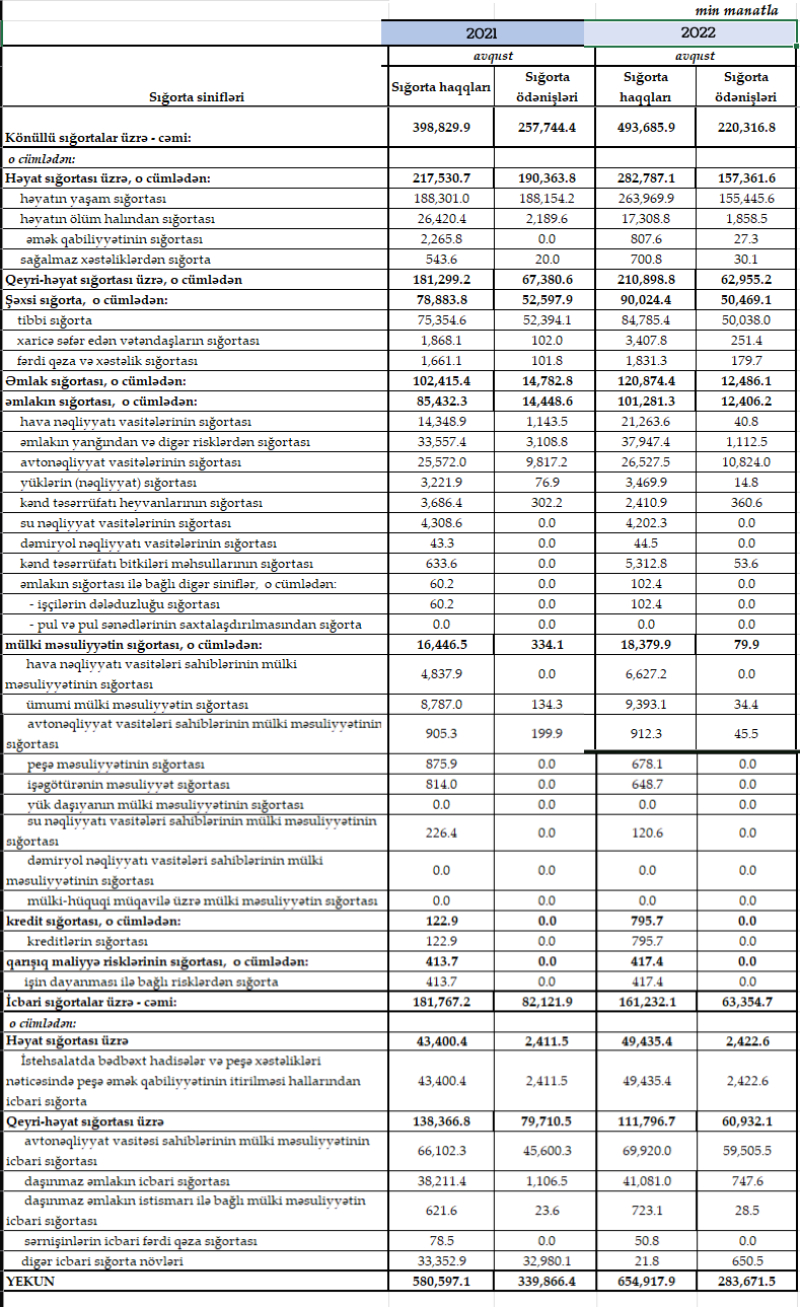 Həyatın yaşam sığortası üzrə sığorta ödənişləri isə 2021-ci ilin yanvar-avqust dövründə 188 milyon 154 min manat ikən, 2022-ci ilin yanvar-avqust dövründə 155 milyon 446 min manat olub.
