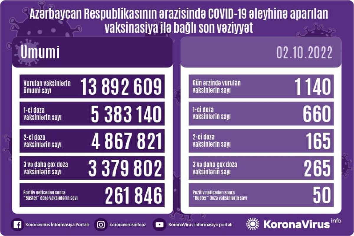 Azərbaycanda son sutkada koronavirus (COVID-19) əleyhinə 1 140 vaksin vurulub. Bir gündə birinci mərhələ üzrə vaksinasiya olunanların sayı 660, ikinci mərhələ üzrə vaksinasiya olunanların sayı 165, 3-cü və daha çox doza üzrə vaksinasiya olunanların sayı 265, pozitiv nəticədən sonra buster doza olunanların sayı isə 50 nəfərdir.