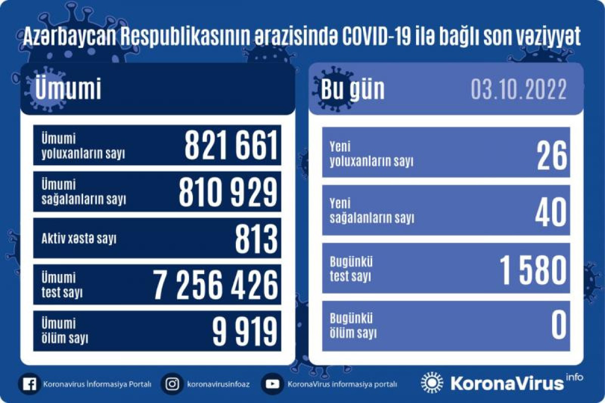 Azərbaycan Respublikasında koronavirus (COVID-19) infeksiyasına 26 yeni yoluxma faktı qeydə alınıb, 40 nəfər müalicə olunaraq sağalıb.
