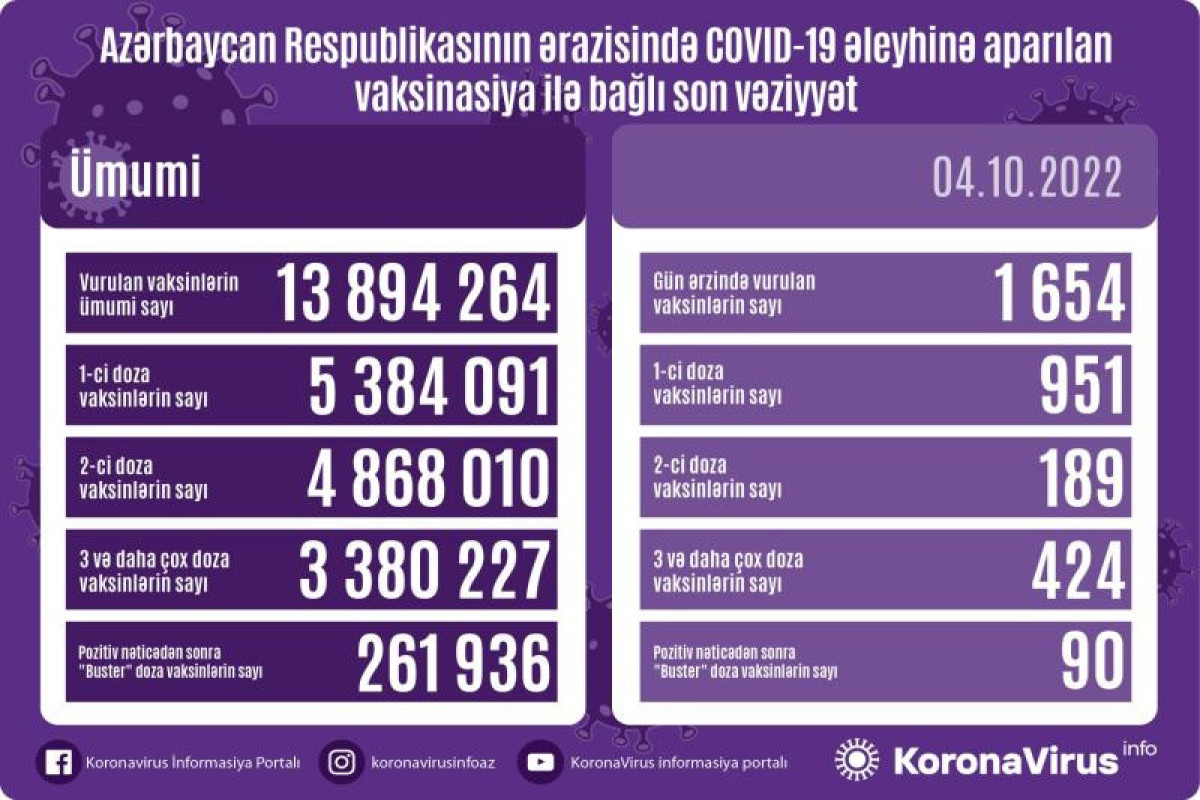 Nazirlər Kabineti yanında Operativ Qərargahdan verilən məlumata görə, bir gündə birinci mərhələ üzrə vaksinasiya olunanların sayı 951, ikinci mərhələ üzrə vaksinasiya olunanların sayı 189, üç və daha çox doza üzrə vaksinasiya olunanların sayı 424, pozitiv nəticədən sonra buster doza üzrə vaksinasiya olunanların sayı 90 nəfərdir.