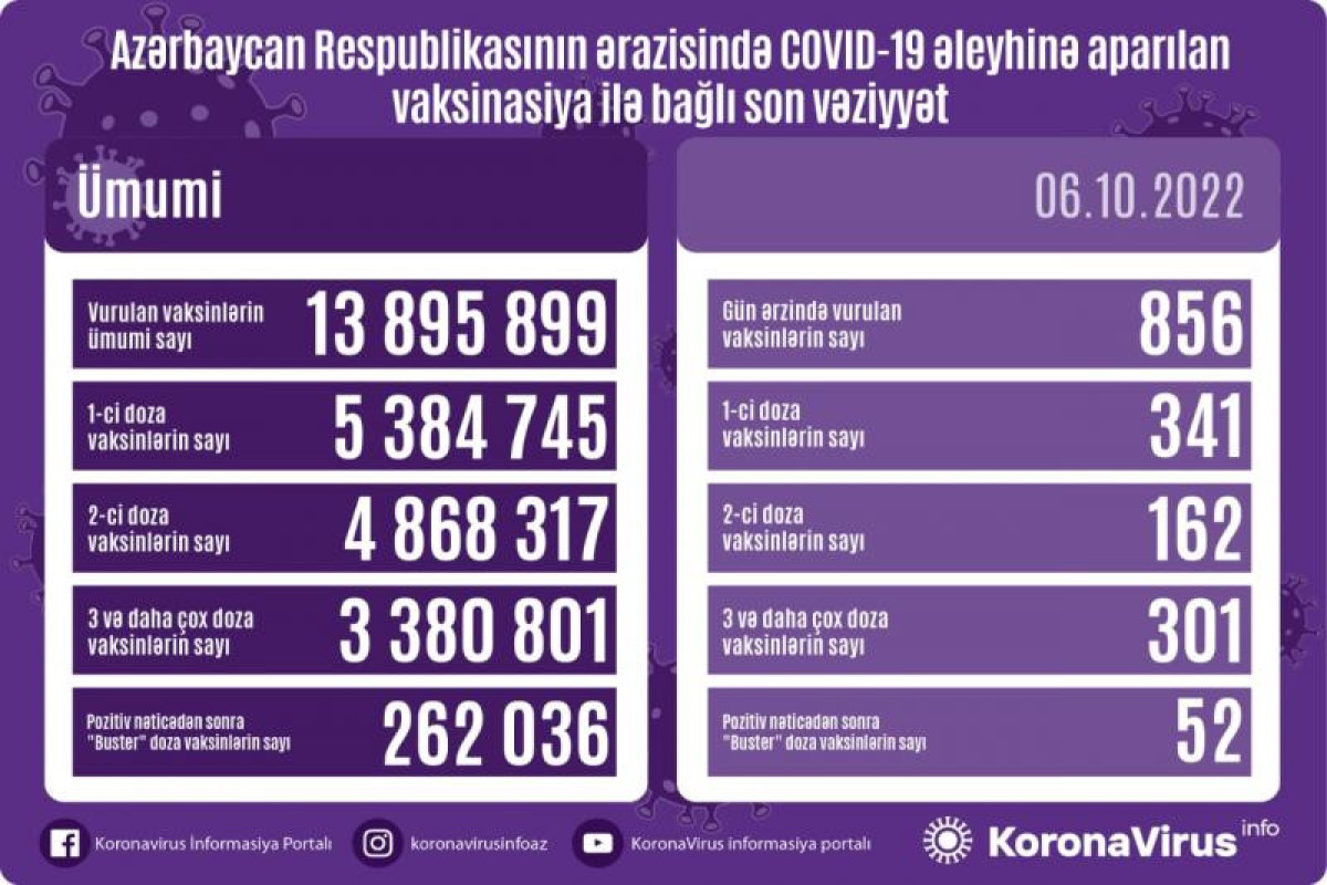 Azərbaycanda son sutkada koronavirus (COVID-19) əleyhinə 856 vaksin vurulub. Bir gündə birinci mərhələ üzrə vaksinasiya olunanların sayı 341, ikinci mərhələ üzrə vaksinasiya olunanların sayı 162, üç və daha çox doza vaksin vurduranların sayı 301 pozitiv nəticədən sonra buster doza üzrə vaksinasiya olunanların sayı isə 52 nəfərdir.