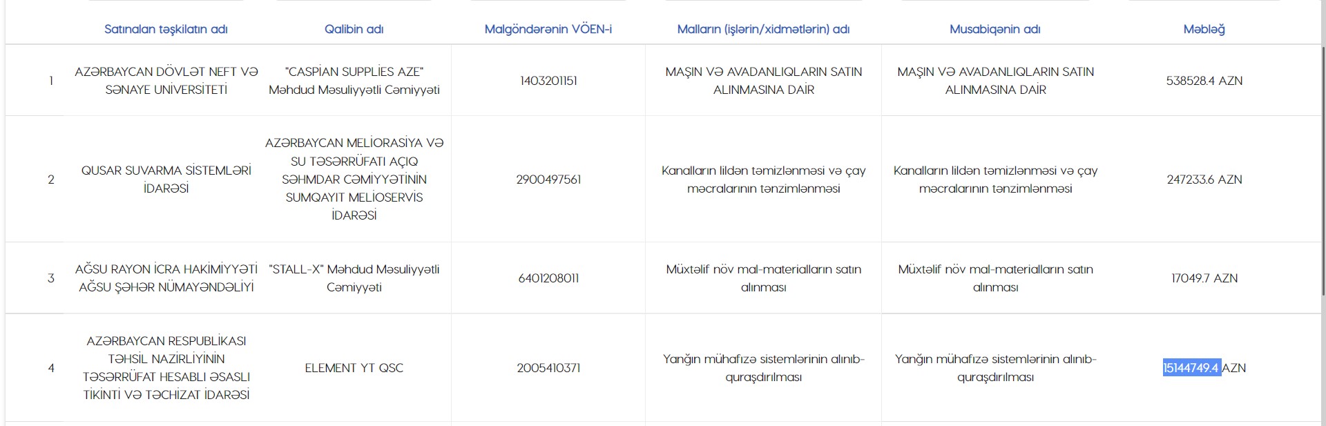 Marja.az xəbər verir ki, tenderin qalibi "ELEMENT YT" QSC-dir.