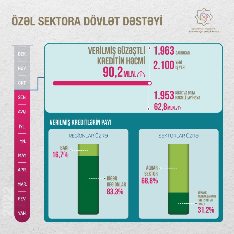 Sahibkarlığın İnkişafı Fondu tərəfindən bu ilin əvvəlindən 1963 sahibkara 90,2 milyon manat, o cümlədən 1953 kiçik və orta həcmli layihəyə 62,8 milyon manat güzəştli kredit verilib.