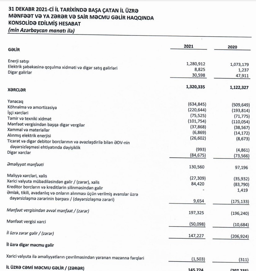 "Azərenerji" ASC 2021-ci ili 147 milyon 227 min manat xalis mənfəət ilə başa vurub. Halbuki, dövlət şirkəti 2020-ci ili 206 milyon 924 min manat xalis zərər ilə bağlamışdı. Xalis mənfəət ilə əlaqədar olaraq "Azərenerji"nin yığılmış zərəri 2 milyard 748 milyon 472 min manatdan 2 milyard 601 milyon 245 min manata düşüb (xalis mənfəət qaədər azalıb). Xalis mənfəət- satışdan gəlirlərin artması, maliyyə xərclərinin azalması və xarici valyuta mübadiləsindən gəlir əldə edilməsi hesabınadır.