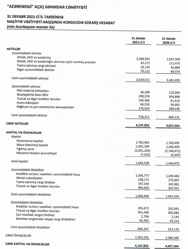 2022-ci il yanvarın 1-nə “Azərenerji”nin aktivləri 4 milyard 147 milyon 832 min manat olub ki, bu da 1 il əvvələ nisbətən 3 % çoxdur. Hesabat dövründə səhmdar cəmiyyətinin öhdəlikləri 3 % azalaraq 2 milyard 503 milyon 293 min manata düşüb, balans kapitalı isə 13,65 % artaraq 1 milyard 644 milyon 539 min manata çatıb.