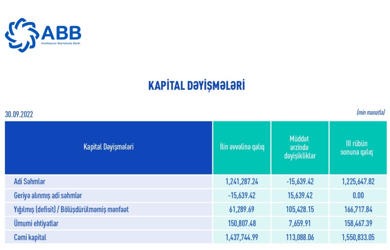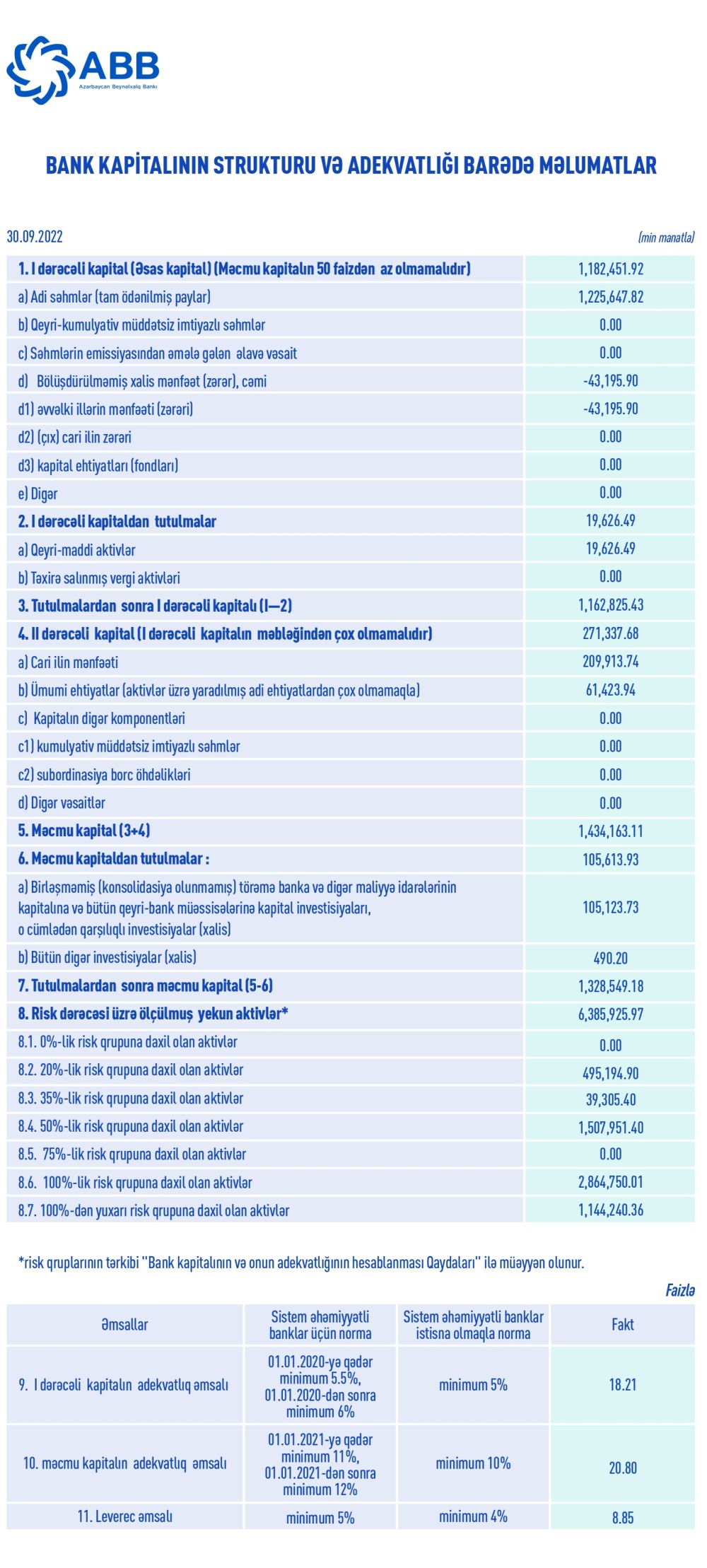 30 sentyabr 2022-ci il tarixində ABB 1 milyard 328 milyon 549 min manat məcmu kapitala malik olub. Bankın əmsalları sistem əhəmiyyətli banklar üçün normaları kəskin üstələyir. Belə ki, 1-ci dərəcəli kapitalın adekvatlıq əmsalı üzrə fakt 18,21% (norma 6%), məcmu kapitalın adekvatlıq əmsalı üzrə fakt 20,80% (norma12%), Leverec əmsalı üzrə fakt isə 8,85% (norma 5%) təşkil edib.