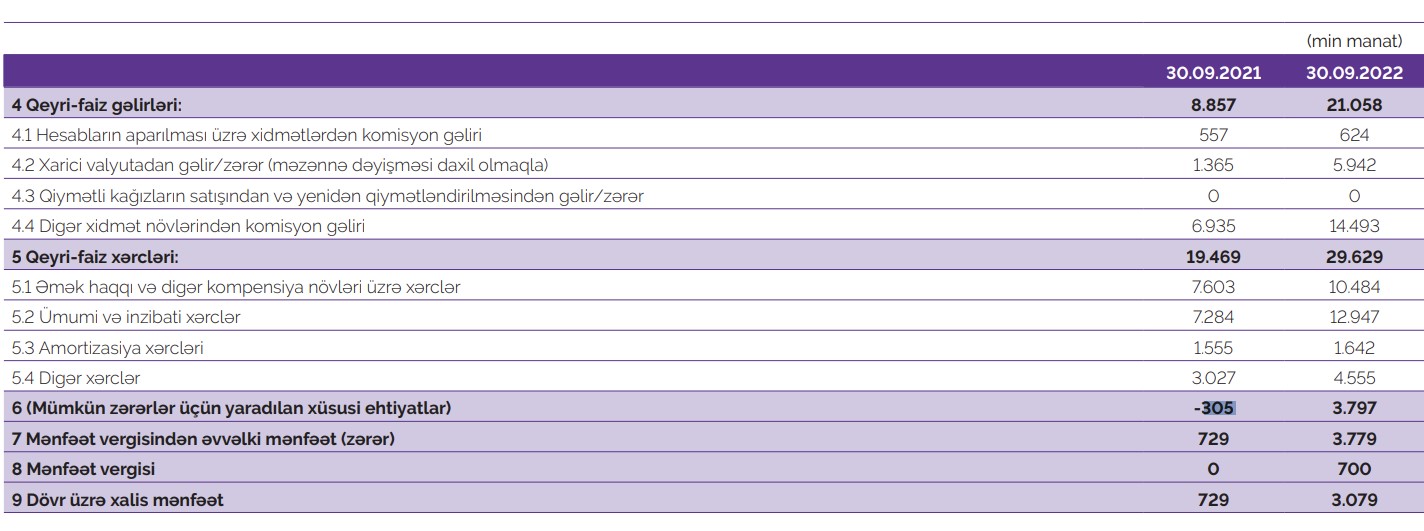 Müqayisə üçün qeyd edək ki, 2021-ci ilin 9 ayında "Azər-Türk Bank"cəmi əməliyyat gəlirləri 24 milyon 388 min manat, cəmi əməliyyat xərcləri 23 milyon 963 min manat, gəlirlər xərcləri üstələdiyindən əməliyyat mənfəəti 425 min manat təşkil etmişdi. Mümkün zərərlər üçün yaradılan xüsusi ehtiyatlardan azad olmuş 305 min manatın hesabına mənfəət 730 min manata yüksəlmişdi.