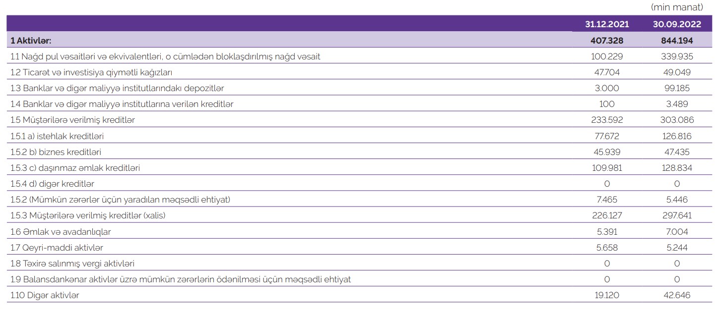 30 Sentyabr 2022-ci il tarixində "Azər-Türk Bank" ASC 844 milyon 194 min manat cəmi aktivlərə malik olub. Bank ötən ilin sonunda 407 milyon 328 min manat cəmi aktivlərə malik idi. Beləliklə, cari ilin 9 ayında Bankın cəmi aktivləri 2,1 dəfə (107%) artıb.