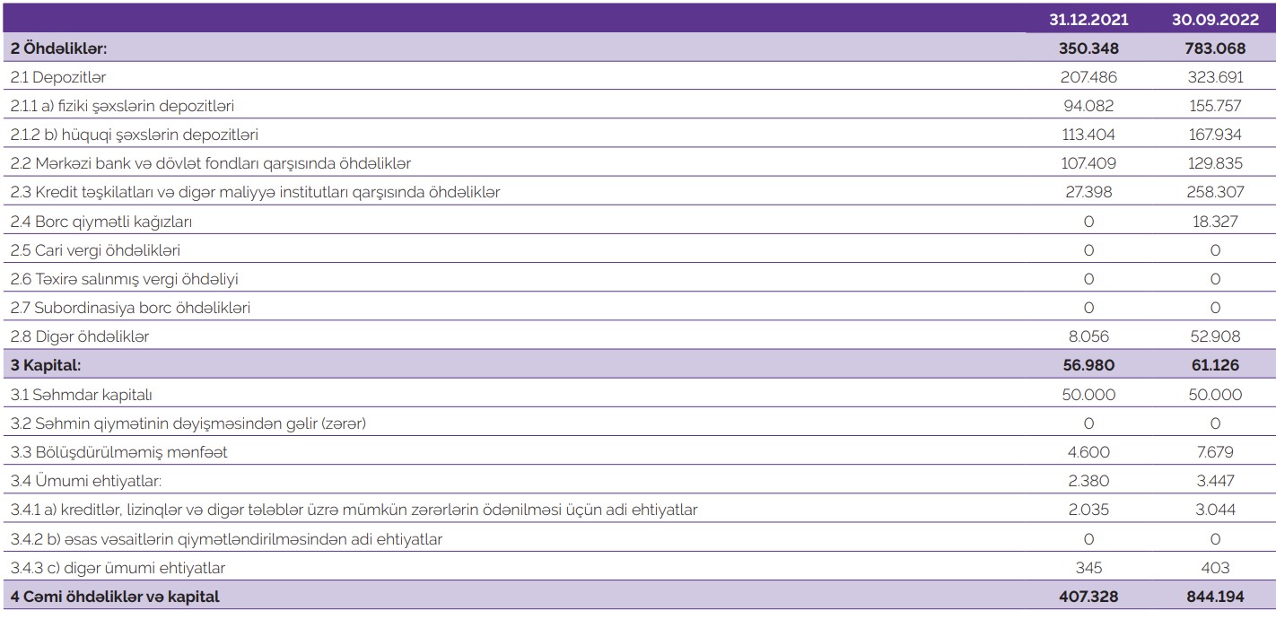 "Azər-Türk Bank"ın aktivlərinin kəskin artması depozitlərin, kredit təşkilatları və digər maliyyə institutlarından cəlb edilmiş vəsaitlərin (kredit təşkilatları və digər maliyyə institutları qarşısında öhdəliklər) artmasından qaynaqlanır. Ötən ilin sonu ilə müqayisədə "Azər-Türk Bank"ın depozit portfeli 116 milyon 205 min manat və ya 56% artaraq 323 milyon 691 milyon manata, kredit təşkilatları və digər maliyyə institutları qarşısında öhdəliklər 9,4 dəfə və ya 230 milyon 909 min manat artaraq 258 miylon 307 min manata yüksəlib.