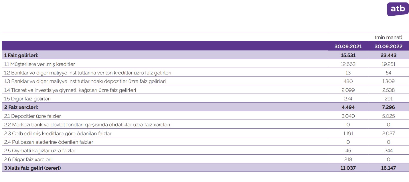 Marja.az xəbər verir ki, 2021-ci ilin yanvar-sentyabr dövründə "Azər-Türk Bank"ın faiz gəlirləri 15 milyon 531 min manat ikən, 2022-ci ilin 9 ayında 23 milyon 443 min manata yüksəlib (50,4% və ya 7 milyon 912 min manat artıb). Bankın qeyri-faiz gəlirləri isə 8 milyon 857 min manatdan 21 milyon 58 min manata qalxıb (2,4 dəfə və ya 12 milyon 201 min manat artıb).