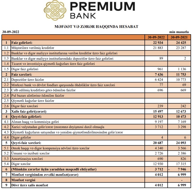Müqayisə üçün qeyd edək ki, 2021-ci ilin 9 ayında "Premium Bank"ın cəmi əməliyyat gəlirləri 34 milyon 898 min manat, cəmi əməliyyat xərcləri 35 milyon 846 min manat, xərclər gəlirləri üstələdiyindən əməliyyat zərəri 948 min manat təşkil etmişdi. Mümkün zərərlər üçün yaradılan məqsədli ehtiyatlardan qayıtmış 7 milyon 946 min manatın hesabına əməliyyat zərəri bağlanmış və bank həmin dövü 6 milyon 999 min manat xalis mənfəət ilə başa vurmuşdu.