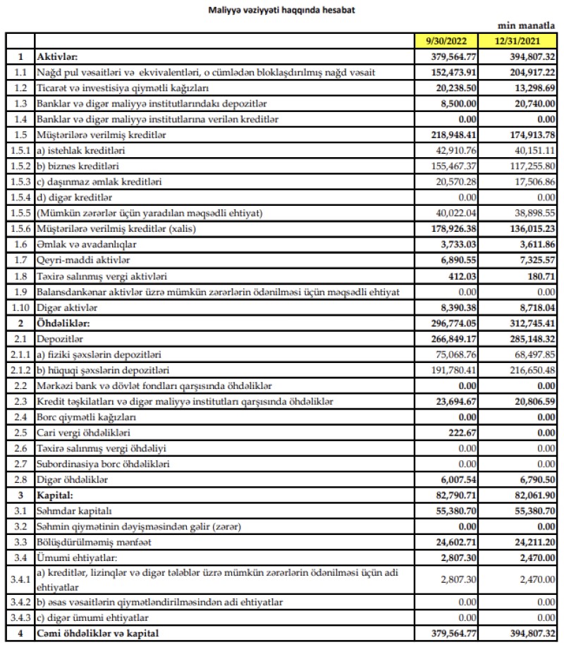 Bankın istehlak və biznes kreditlərinə olan müştəri marağı öz əksini ümumi rüblük hesabatda tapmışdır. Belə ki, keçən ilin sonu ilə müqayisədə bankın ümumi kredit portfeli 25% artmış və 219 milyon manat olmuşdur, eyni zamanda cari ilin üçüncü rübündə biznes kreditləri 33% artaraq 155,5 milyon manata bərabər olmuşdur, həmçinin müştərilərin ehtiyaclarını nəzərə alaraq təklif edilən istehlak kreditləri portfeli 7% artaraq 43 milyon manat olmuşdur.