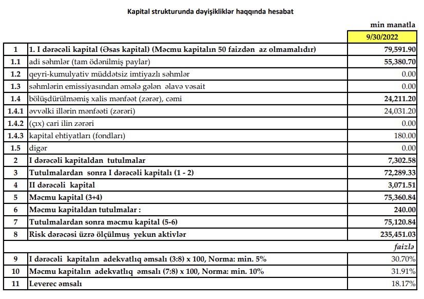 2022-ci ilin III rübünün göstəricilərinə əsasən “Yapı Kredi Bank Azərbaycan” QSC Azərbaycan Mərkəzi Bank tərəfindən müəyyən olunmuş prudensial normativləri lazımı səviyyədə yerinə yetirmişdir. Belə ki, müvafiq dövrün sonuna bankın I dərəcəli kapitalının adekvatlıq əmsalı 31%, məcmu kapitalının adekvatlıq əmsalı isə 32% olmuşdur. Bankın məcmu kapitalı 75.1 milyon manat təşkil edib. Qeyd edək ki, mövcud qanunvericiliyə əsasən minimum məcmu kapital norması 50 milyon manatdır.