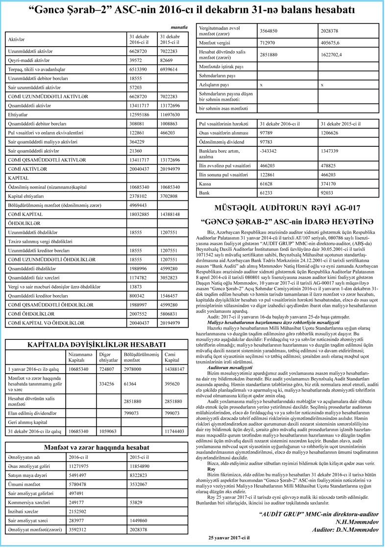 “Gəncə Şərab–2” ASC 31 Dekabr 2016-cı il tarixinə balans hesabatını dərc edib.