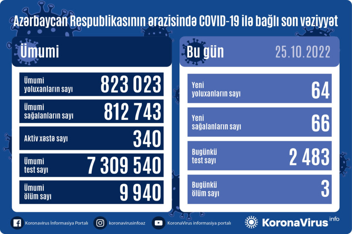 Azərbaycan Respublikasında koronavirus (COVID-19) infeksiyasına 64 yeni yoluxma faktı qeydə alınıb, 66 nəfər müalicə olunaraq sağalıb.