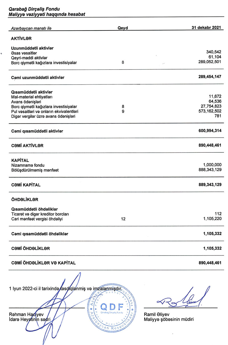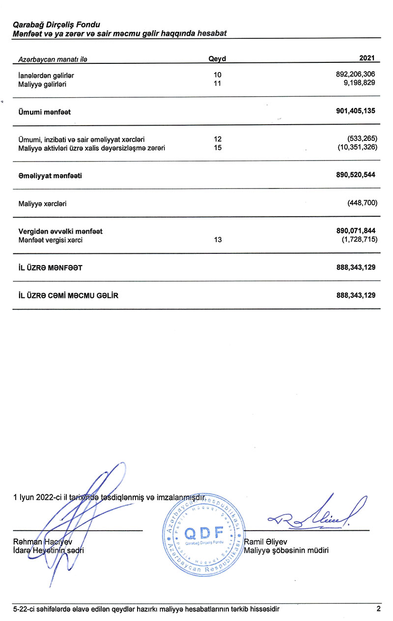 Qarabağ Dirçəliş Fondu 2021-ci ili 888 milyon 343 min manat xalis mənfəət ilə başa vurub. Ötən il Fondun cəmi gəlirləri 901 milyon 405 min manat, cəmi xərcləri isə 13 milyon 62 min manat təşkil edib.