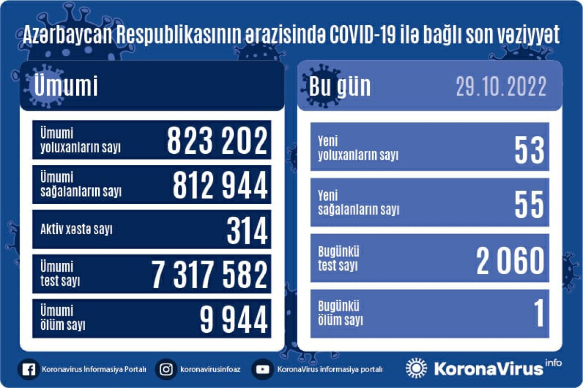 Azərbaycan Respublikasında koronavirus (COVID-19) infeksiyasına 53 yeni yoluxma faktı qeydə alınıb, 55 nəfər müalicə olunaraq sağalıb.
