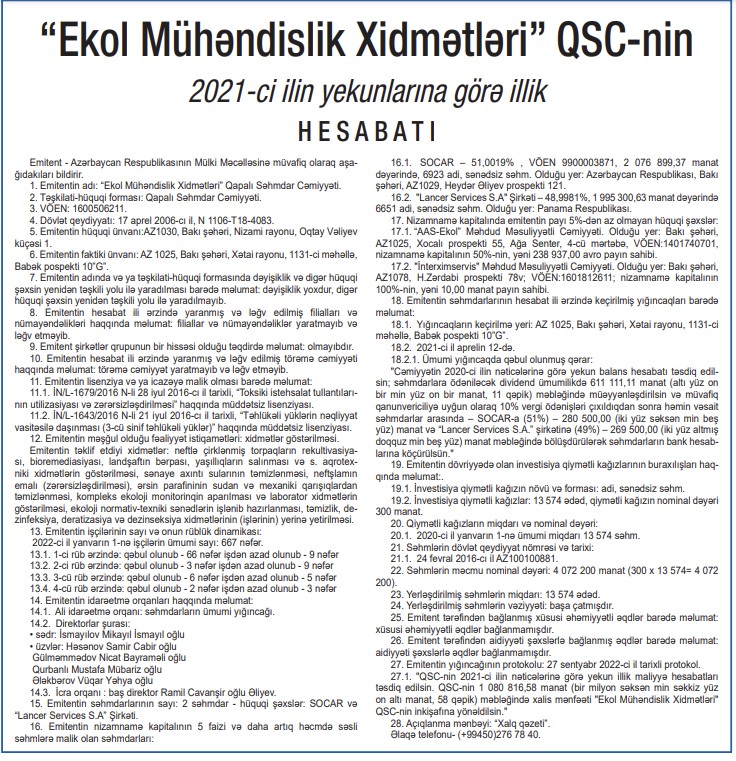 Marja xəbər verir ki, bu, “Ekol Mühəndislik Xidmətləri” QSC-nin 2021-ci ilin yekunlarına görə illik hesabatında bildirilir.