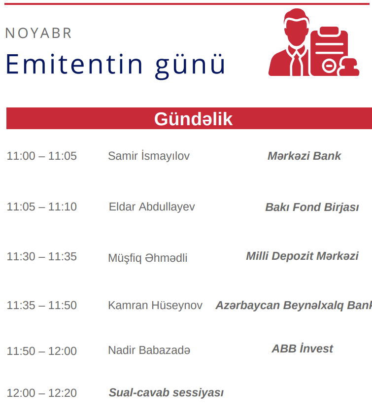 “Azərbaycan Respublikası Mərkəzi Bankı”, “Bakı Fond Birjası” QSC, “Azərbaycan Respublikasının Milli Depozit Mərkəzi” və “ABB-İnvest İnvestisiya şirkəti” QSC iştirak edəcəyi görüşdə emitent olaraq “Azərbaycan Beynəlxalq Bankı” ASC çıxış edəcəkdir.