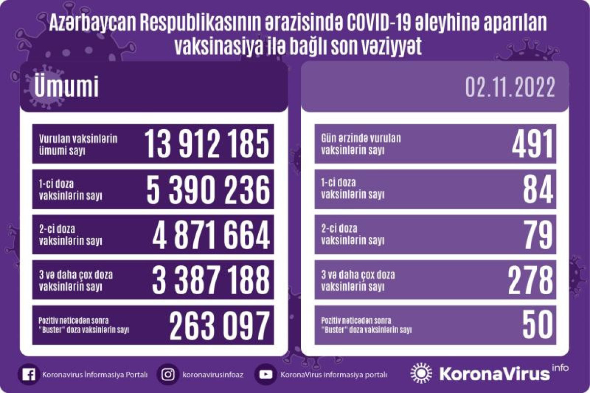 Azərbaycanda son sutkada koronavirus (COVID-19) əleyhinə 491 vaksin vurulub. Bir gündə birinci mərhələ üzrə vaksinasiya olunanların sayı 84, ikinci mərhələ üzrə vaksinasiya olunanların sayı 79, üç və daha çox doza üzrə vaksinasiya olunanların sayı 278, pozitiv nəticədən sonra buster doza üzrə vaksinasiya olunanların sayı 50 nəfərdir.