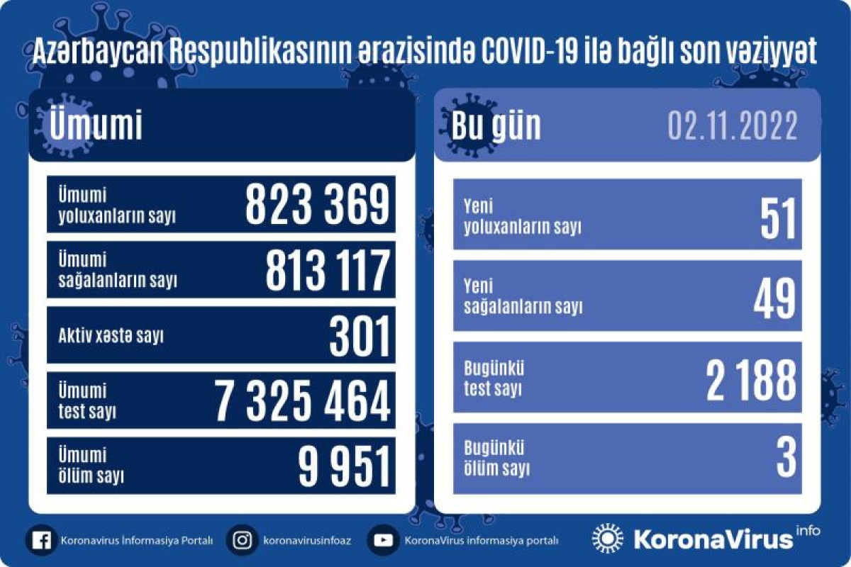 Azərbaycan Respublikasında koronavirus (COVID-19) infeksiyasına 51 yeni yoluxma faktı qeydə alınıb, 49 nəfər müalicə olunaraq sağalıb.